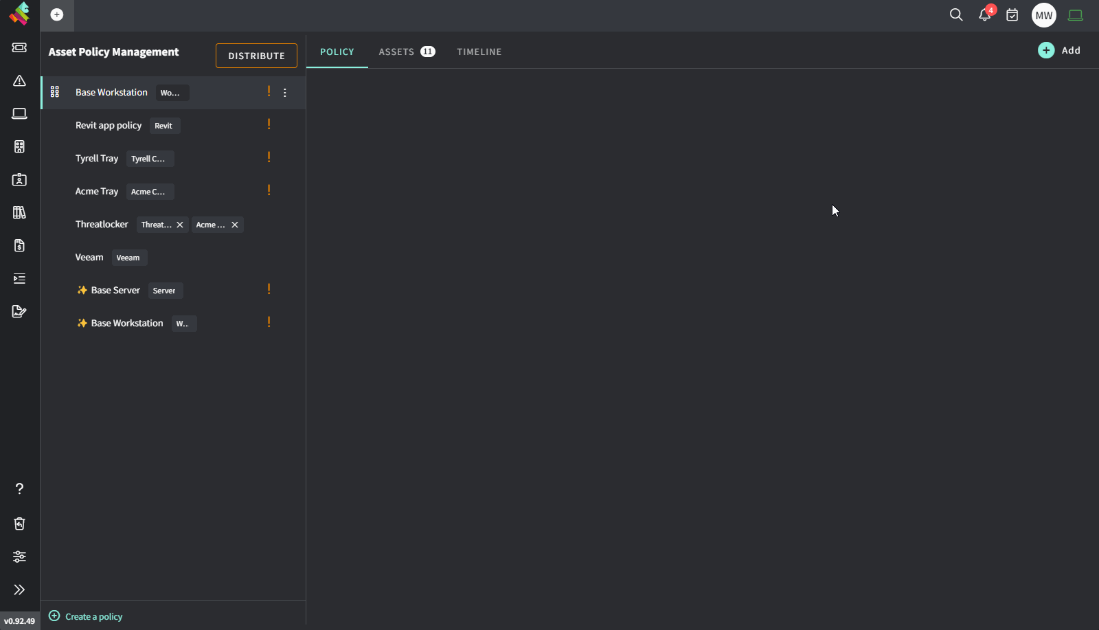 Policies are used to distribute checks, plugins, and scripts to assets via the use of tags. Let's create our first policy to distribute the Screenconnect plugin to all workstations.